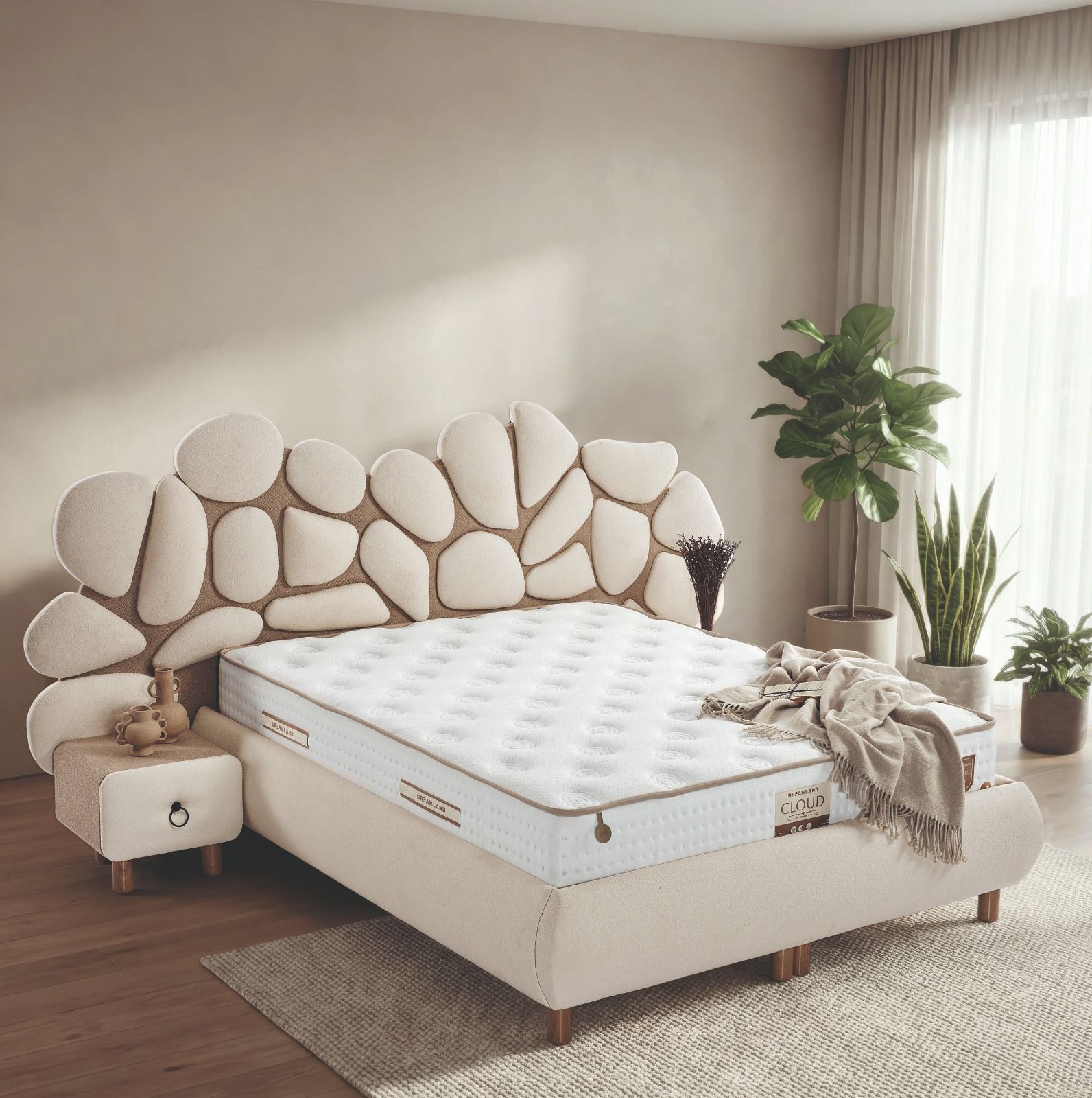 Doğadan ilham alan benzersiz başlık tasarımıyla bu yatak, yatak odanıza sakinlik ve estetik bir denge getirir. Taş dokusunu andıran