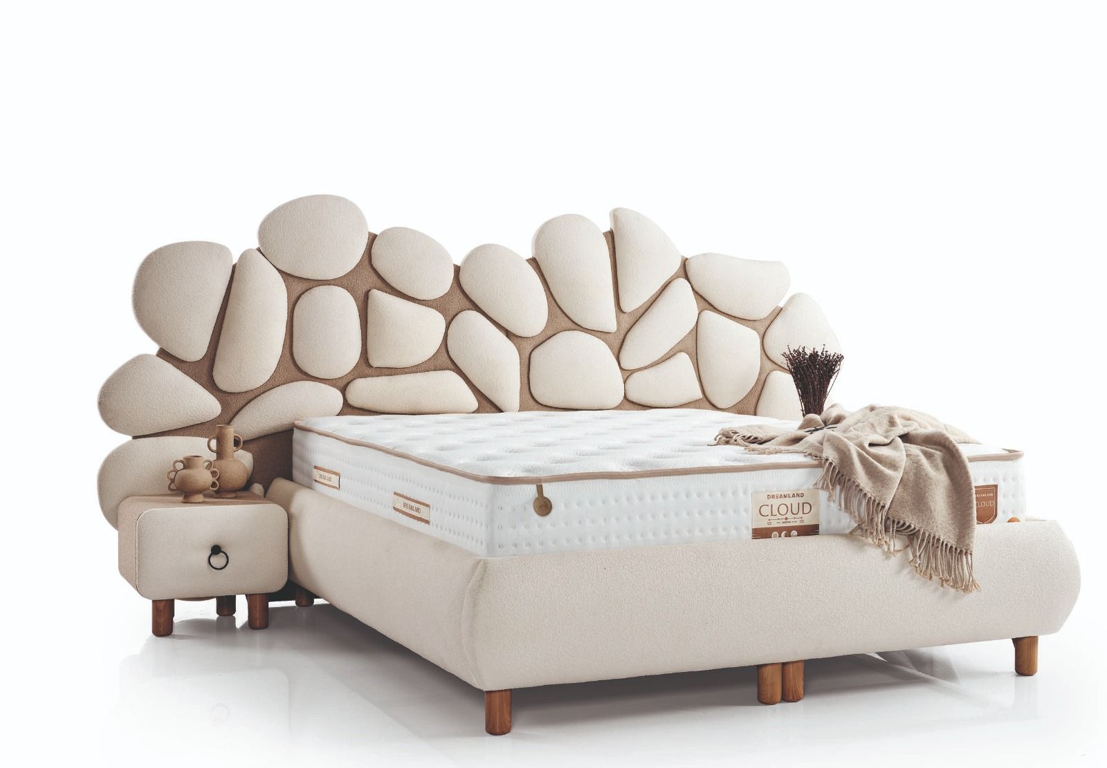 Doğadan ilham alan benzersiz başlık tasarımıyla bu yatak, yatak odanıza sakinlik ve estetik bir denge getirir. Taş dokusunu andıran